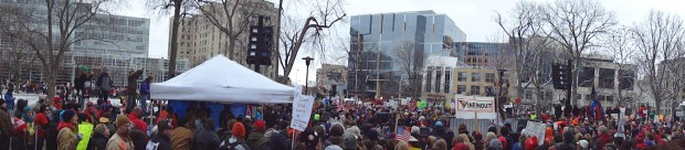 I had no idea what to expect at the Madison Capitol square on Saturday. There was so little Twin Cities media coverage after last weeks massive rally that I thought protests might all be over. Wrong! Somehow ‘only’ 30 -40k citizens converging on the State Capitol in brisk winter conditions to speak out against Governor Scott Walker’s plan to curtail collective bargaining has become ‘ordinary’, and not significantly newsworthy.
