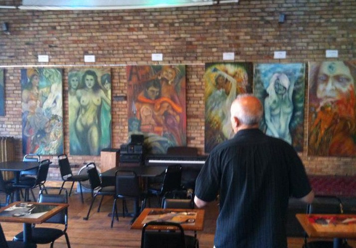 Roger Williamson of Magus Books and Herbs has a one person art show of his paintings entitled, “God Factory” , Mystery IS Energy… but what does that mean? opening this weekend at The Nicollet. Comets-ov-Cupid and Jealous Jester will offer live music for the opening reception 7pm Saturday, October 8. The Nicollet is a spacious relaxed space with fine coffee and food at the NE corner of Franklin and Nicollet Avenues in Minneapolis. I talked to Roger about his art.