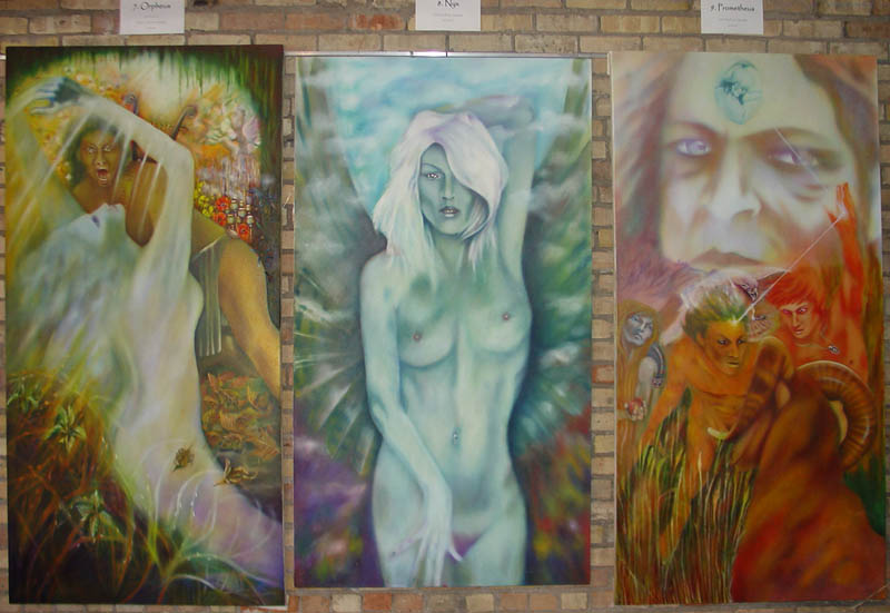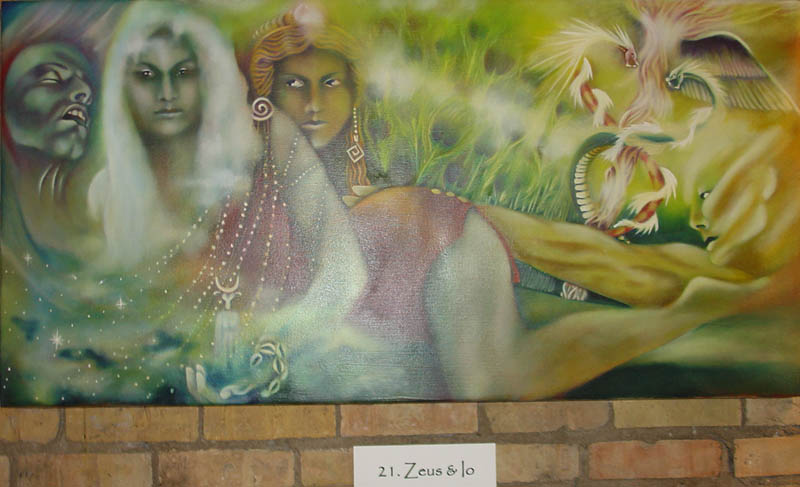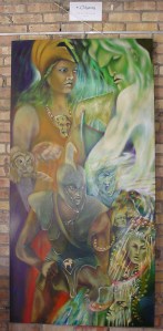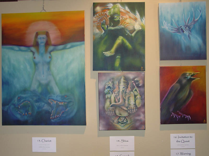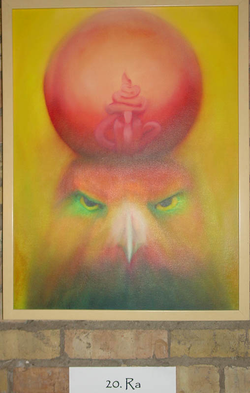 I was writing a book and I needed an image of the Lovers tarot card. I had never been happy with the images that were available. My art started from there. I was working in pastels then and did a series on the Enochian workings on the Earth Tablet. I did some automatic drawings about these experiences. It was like this floodgate opened, I couldn’t stop just churning out these pictures. It was almost like an exorcism. This started about thirteen years ago when I really started. It was such a shock when I would get one of these pastels framed, it was so expensive. I switched to oil so when I got one done I could just pound a nail in the wall and hang it up. I transferred my pastel technique to oil and then worked from there.