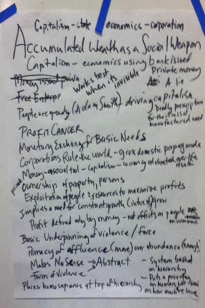 Each group kept notes on its discussion with the aim of discovering insights, and gleaning items for later general assembly proposal and consideration. Every fifteen minutes or so, the groups paused and people rotated among them as they felt called. I participated in the visioning, direct action, and diversity groups. At the end of the session, spokespersons from each group summarized the discussion and outlined items that deserved further work to integrate the ideas within OccupyMPLS. A contact person and email was established for each work group and a sign-up for messaging within each group was posted.