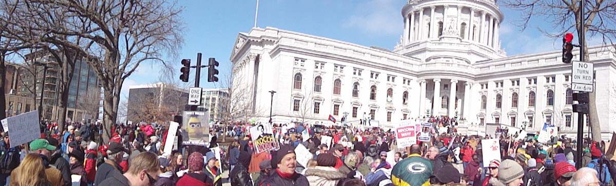 At approximately 4pm yesterday, March 9th, notice was given of an impending “special committee” hearing, by Republican Senators in Madison, of a bill to separate state worker collective bargaining rights from budget issues. A budget issue needs a 2/3 quorum where non fiscal issues only require a majority in the Wisconsin senate. The 19 Republicans met at 6pm, and by 6.45 the vote had been taken, eighteen to one, to approve the ‘plan’.