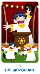 That difference in view translates into the artwork. In Blodgett’s deck, the hierphant is not shown weighed down by two large metal keys or covered in thick church robes. He’s shown enthusiastically leading what looks like a Pagan version of a tent revival while holding a Book of Shadows.